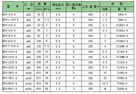 KCG高溫齒輪油泵●用途 塑料橡膠加工工業(yè),紡織印染工業(yè),涂料工業(yè),木材加工工業(yè),食品業(yè)、造紙印刷等液態(tài)熱載體加熱載體加熱傳輸?shù)雀鞣N工業(yè)。 ●應(yīng)用范圍 KCG高溫齒輪油泵適用于輸送不含固體顆粒和纖維,無腐蝕性的高溫液體,介質(zhì)溫度可達(dá)250℃,粘度為5-1500cst。 ●結(jié)構(gòu)型式 本系列的齒輪泵由齒輪、軸、泵體泵蓋、軸端密封等零部件組成,所有零件均選用合適的耐溫材料制造。泵內(nèi)運(yùn)轉(zhuǎn)零件均利用其輸送的介質(zhì)潤滑。 KCG型泵配有安全閥,可防止超載對(duì)泵和電機(jī)造成損壞。 常用KCG高溫齒輪油泵性能參數(shù)表